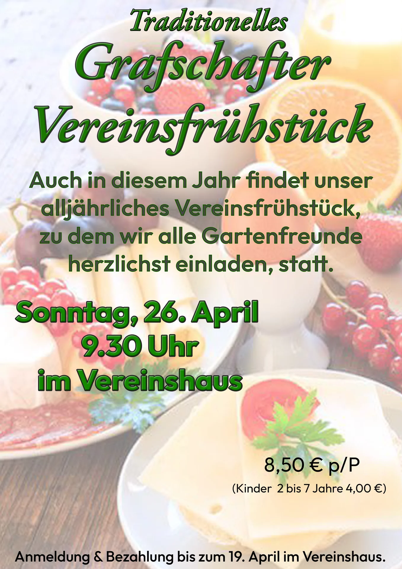 26.04.2026 Grafschafter VereinsfrühstückEs werden noch Helfer benötigt. Bitte bei Gabi Rippel (Garten 2) melden.